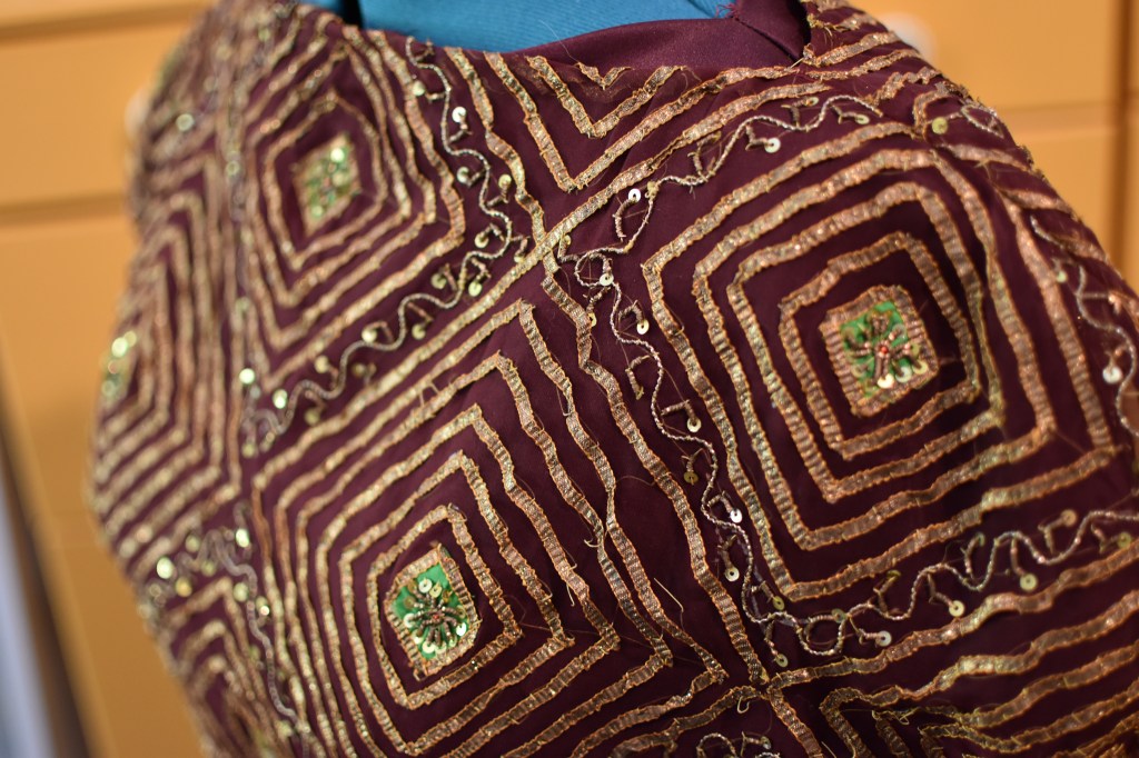 I bought an old silk dupatta on ebay and a matching poly satin lining. The dupatta took quite a bit of love and repair and clever cutting to make it work and I ended up having to create a plain waistband to get to the length I wanted. However, I didn’t give myself enough time to finish this project (and I never will tbh) so I really don’t like how the plain waistband attracts too much attention to the waist. Also none of the edges are finished and I wore so many safety pins to that NYE party, I would have tripped a metal detector.