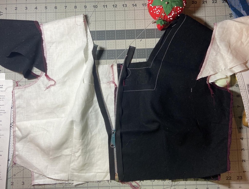 My plan was just to use some linen scraps in my stash and instead of fiddling with buttons I found a separating zipper. The color blocking already elevated it to a modern aesthetic and I think the zipper added just a little bit more to it.