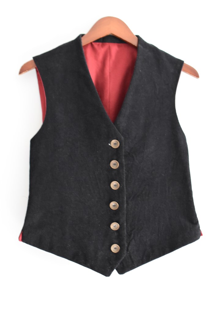 I also made my partner’s vest using Folkwear 222. The instructions were a tad confusing, but that might be because I’ve never made any tailored garment before. I was shocked that the short collar actually stood correctly my first try. I made view A and it’s constructed very interestingly. The collar band is built in to the front panels and to attach them to the back piece you have to do some crazy turning with some bulky seams. But it turned out fine and I heard no complaints about it being uncomfortable, though I was accused of dressing him like an early 2000s emo kid.