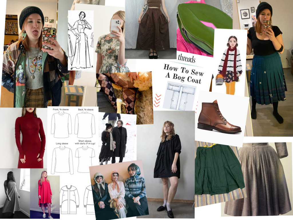 my quilted barn coat / 50s housecoat sewing pattern / rosery apparel ig / spaghetti western skirt / lips bag / moth eaten wool skirt visible mend / plaid tights / bog coat diy / Louisa Clark by dawoon / thursday boot / nuit turtleneck dress / barbie top pattern / helena bonham carter / spaghetti western dress / secondhand wool skirt / cartridge pleated dress / jersey dress / blueprints coat / headscarf