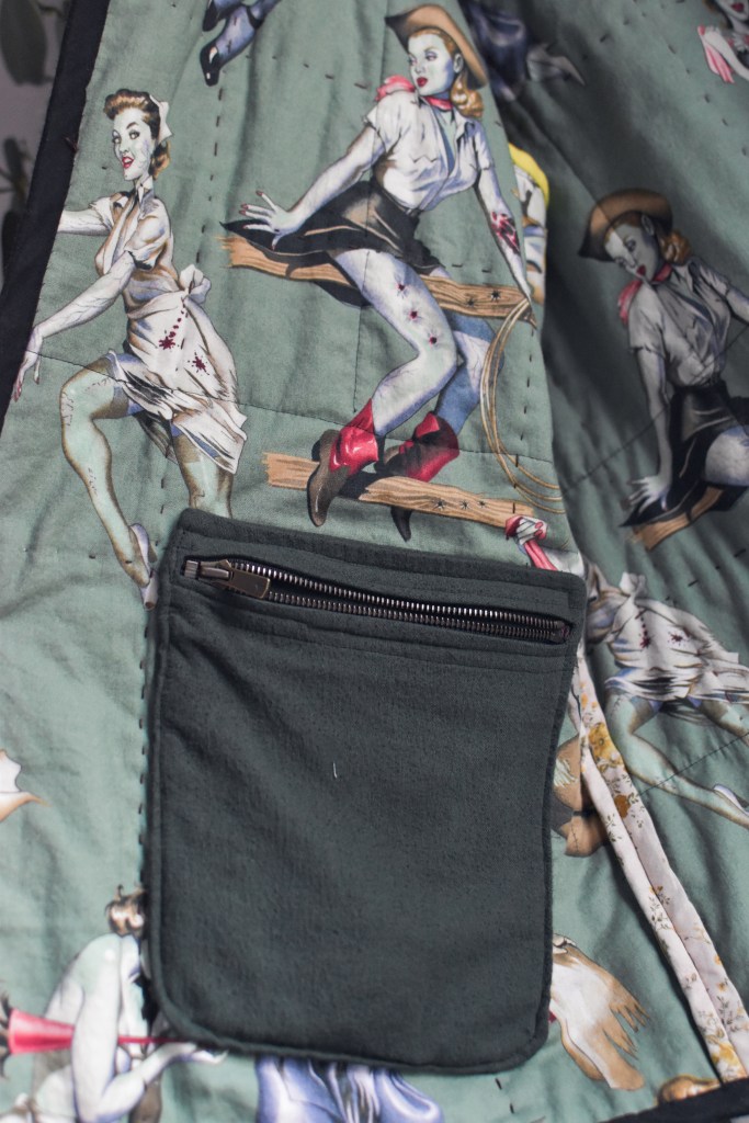 Tip 6: embrace your scraps bin, even for the insides. You don’t have to use proper quilting batting and keep in mind how thick and fluffy you want your jacket to be. I personally used two layers of leftover cotton flannel as the batting and I wear this jacket in Indiana winters and stay nice and warm. I mean, except for the fact that it doesn’t have a closure which leads me to—