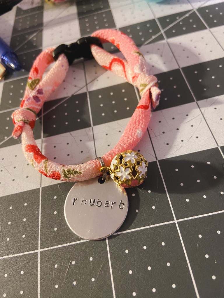 The stockings ended up a little more grandma than I was going for, but that’s okay.Tag is from this etsy shop and I added an “rx” tag from my new metal stamping kit. I watched Isle of Dogs recently and was inspired by the dog with the baseball collar (my partner is obsessed with baseball and this is his favorite cat)This is the tag that started this whole project. Trill Paws sells custom emoji pet tags and I’ve always wanted a special tag for my cat named Calcifer. (The other side has the custom info but that’s also where my phone number is so you don’t get to see that lol)Featuring her Christian name and her street name for her two personalities. I bought a metal stamping kit to play around with but then I forgot it didn’t come with numbers…