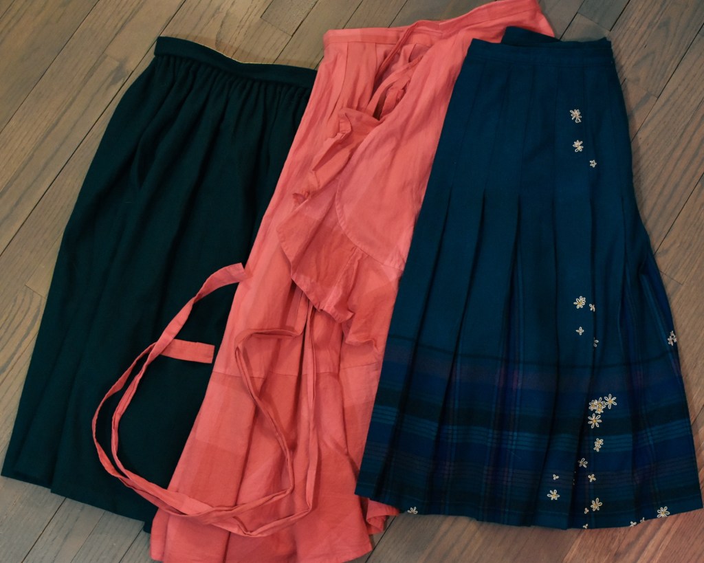 The second wool skirt is my favorite thing I worked on last winter. I found another 80s wool skirt for a couple bucks in a rummage bin at a nice thrift store. It was just covered in moth holes, but it was the perfect size. I dyed it to tone down the 80s turquoise and covered the holes in daisies. Also needs its own blog post so I can gush over it and how much I love visible mending as a concept.