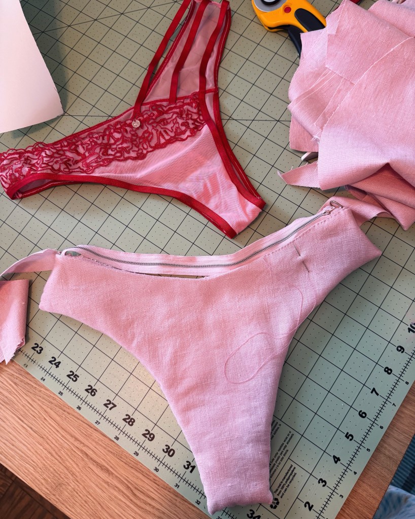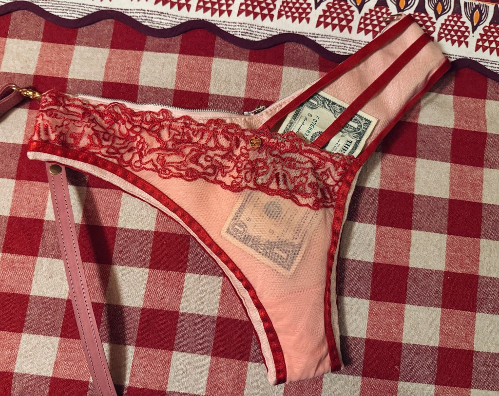 Construction notes: I created a pattern for the pink linen shell based on the pair I was using. I added seam allowance, sewed up all the sides by machine and decided to hand sew in the zipper to get the perfect fit. Shockingly I just happened to have the perfect color zipper to match the scrap fabric that almost perfectly matched the panties. Since the outside leg seams would be visible on the sides, I decided I didn’t care about having the raw edges inside since it wouldn’t be a very frequently used bag. I also added some small D rings I harvested from an old phone case to either side of the zipper so I could attach a clip-on purse strap that I borrowed from another purse. However, I did add a credit card/ID pocket to the lining which I highly recommend for anyone making their own bag. I’m always so paranoid about reaching into my bag during a dark show or whatever and accidentally dropping my cards or money on the ground (a thing I may have done before).